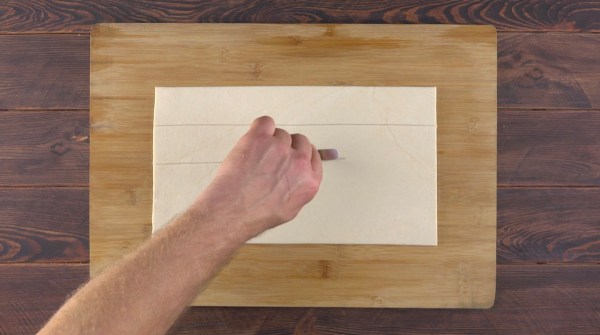 - À l'aide d'une roulette à pizza, coupez la pâte feuilletée en quatre bandes d'environ 5 x 25 cm de long.