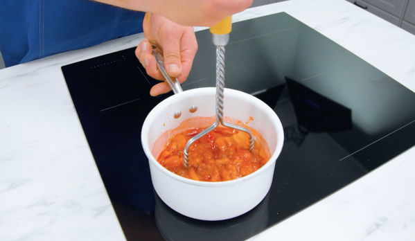 - Pour préparer la sauce à la fraise, retirez d'abord les queues des fraises. Faites bouillir les fruits avec le sucre et le jus de citron et écrasez le tout avec un écrase-purée ou une fourchette.