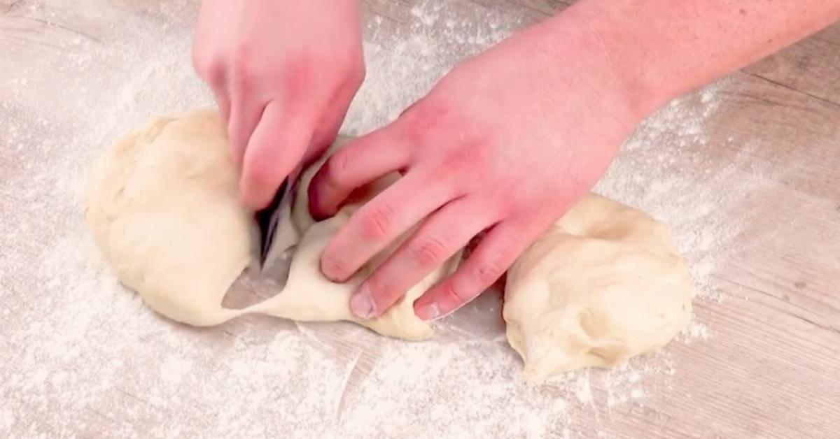 - Sur une surface enfarinée, divisez la pâte en trois morceaux de taille égale.