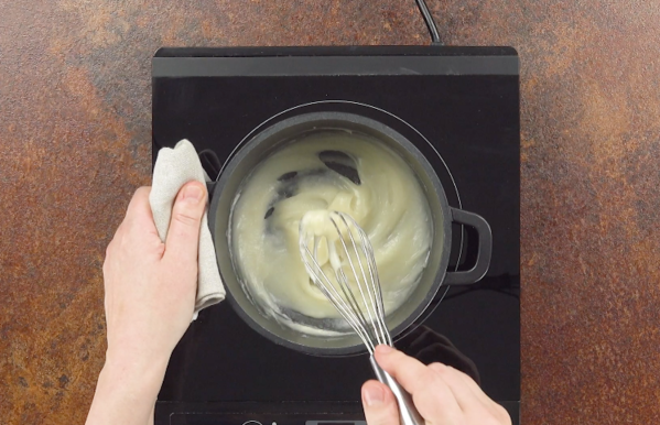 - Mélangez l'eau et la farine dans une casserole et faites chauffer à feu doux jusqu'à l'obtention d'une consistance crémeuse. Recouvrez de film alimentaire puis mettez le tout au frais 4 à 6 heures.Remarque : mieux vaut préparer cette mixture la veille de façon à bien la laisser refroidir.