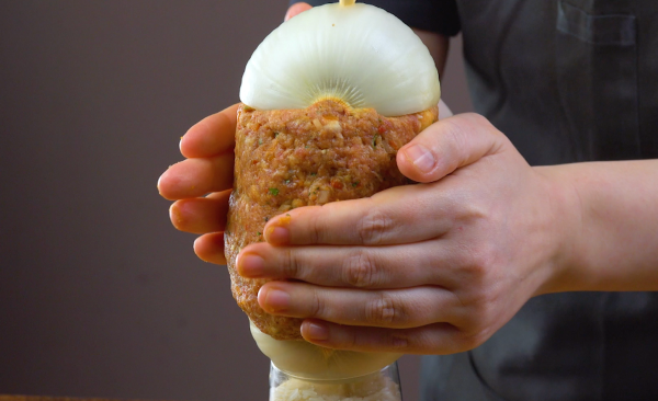 - Versez le riz dans un verre long et mettez une longue brochette à l'intérieur. Ensuite, embrochez une grosse couche d'oignon sur le bâton (creux vers le haut) et poussez le tout vers le bas. Remplissez le creux de viande hachée. Répétez l'opération jusqu'à ce que la première moitié de l'oignon soit épuisée.