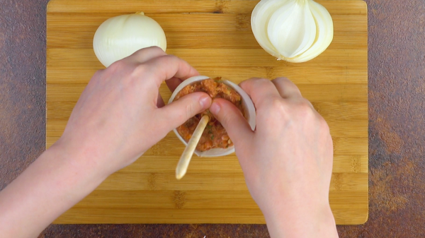 - Embrochez la plus petite pelure (de l'autre moitié), sur laquelle vous répartissez également la viande hachée et répétez le tout, de la plus petite à la plus grande couche, jusqu'à ce que l'autre moitié de l'oignon soit épuisée. Enfin, recouvrez toute la partie centrale de viande hachée.