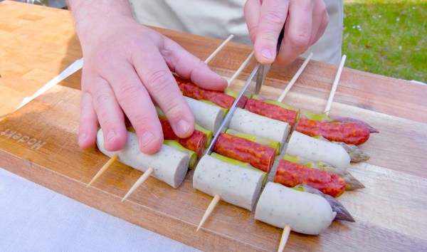- Placez quatre asperges côte à côte, en alternant deux saucisses blanches et deux merguez. Transpercez-les ensuite à intervalles réguliers avec quatre brochettes et coupez-les en deux. Répétez l'opération pour obtenir un total de huit brochettes.Enduisez les brochettes d'huile pour qu'elles ne collent pas à la grille. Faites ensuite griller les brochettes pendant environ 5 minutes de chaque côté.Servez les brochettes avec la salade de pain et le chutney aux fraises et au piment.