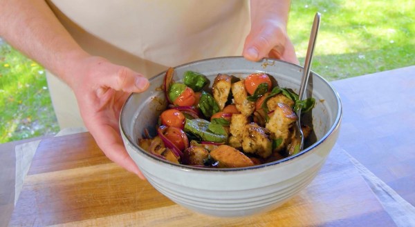 - Pendant ce temps, préparez la salade : Coupez d'abord la ciabatta en cubes ; ils doivent être à peu près aussi gros que les tomates. Alternez ensuite les cubes de pain et les tomates sur les brochettes et faites-les griller sur le barbecue. Détachez-les ensuite des brochettes et ajoutez des feuilles de basilic ainsi que des rondelles d'oignon. Mélangez l'huile et le vinaigre balsamique et versez le mélange sur la salade en guise de vinaigrette. Assaisonnez ensuite la salade avec du sel et du poivre.