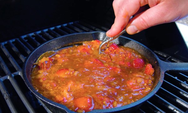 - Lavez les fraises, embrochez-les et faites-les griller brièvement de tous les côtés sur le barbecue.Pour le chutney, faites d'abord caraméliser le sucre brun dans une poêle allant au four sur le barbecue. Faites-y ensuite brièvement revenir les dés d'oignon. Ajoutez ensuite le piment et déglacez avec de l'eau, du vinaigre et du vin blanc. Ajoutez le reste des ingrédients et laissez réduire le tout de moitié environ. Détachez ensuite les fraises grillées des brochettes et ajoutez-les au bouillon. Laissez mijoter pendant environ 30 minutes, écrasez les fraises et remuez régulièrement.
