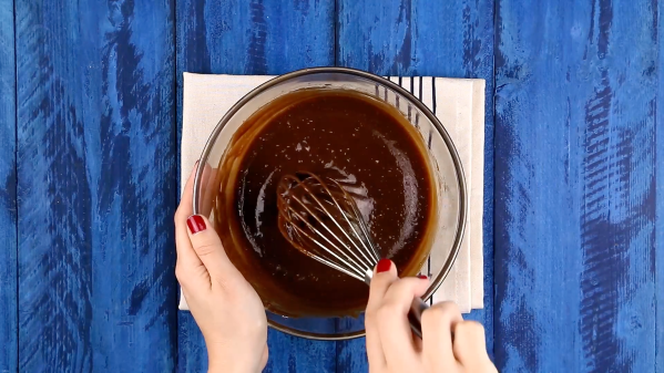 - Quand tout est bien liquide, retirez du feu et ajoutez la farine, les œufs, le sucre et la levure chimique. Mélangez le tout pour obtenir une pâte au chocolat homogène.