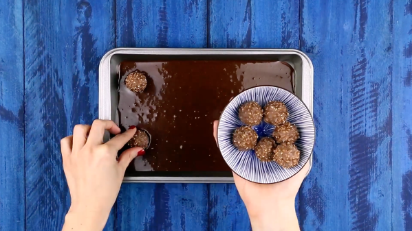 - Faites chauffer le four à 180 °C. Faites fondre quatre Ferrero Rocher et le chocolat noir réduits en morceaux avec le beurre, au bain-marie.