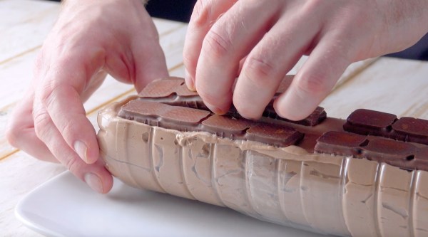 - Placez une grille sur une plaque de cuisson pour recueillir l'excédent du glaçage. Posez le dessert dessus et retirez la bouteille. Versez le chocolat au lait liquide uniformément sur le dessert. Une fois le glaçage sec, versez le chocolat blanc sur le dessert. Coupez les 2 dernières barres et posez-les sur le dessert en guise de garniture.