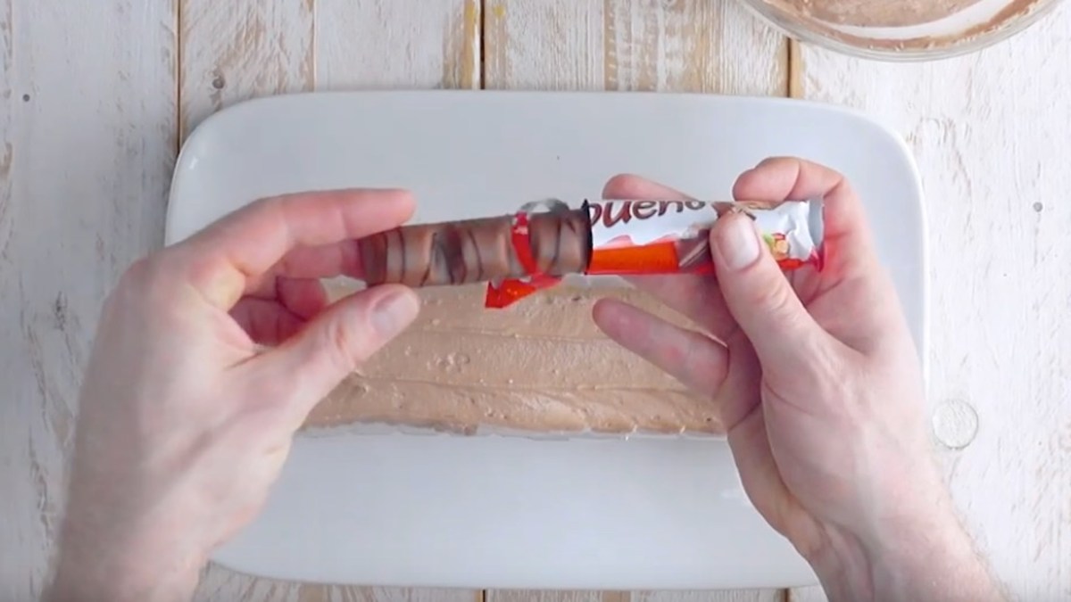 - Remplissez 1/3 de la bouteille avec la crème puis placez deux barres de Kinder Bueno au milieu du moule. Remplissez le moule avec le reste de la crème. Déposez 6 barres. Mettez le tout au congélateur pendant 3 heures.