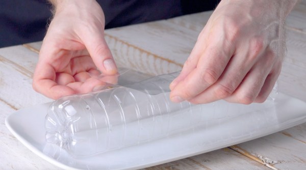 - Séparez la partie supérieure des bouteilles pour obtenir deux cylindres droits. Coupez environ un tiers de cette surface de chaque côté, de sorte que les cylindres ressemblent à un tunnel. Faites se chevaucher les cylindres en plastique de quelques centimètres et fixez-les avec du ruban adhésif. Tournez le moule avec le côté ouvert vers le haut.
