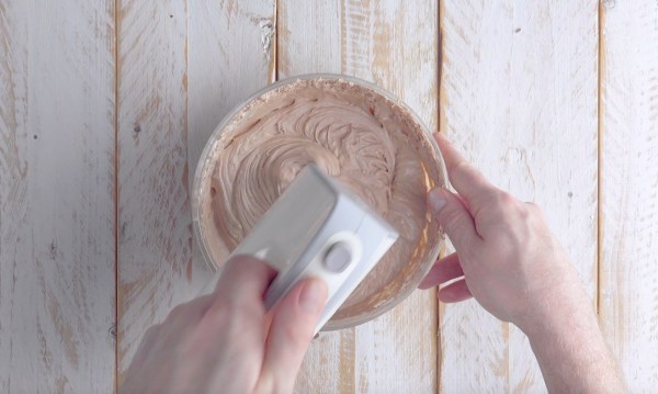 - Fouettez la crème jusqu'à ce qu'elle soit ferme, ajoutez le Nutella et continuez à remuer jusqu'à ce que la crème soit uniformément colorée.