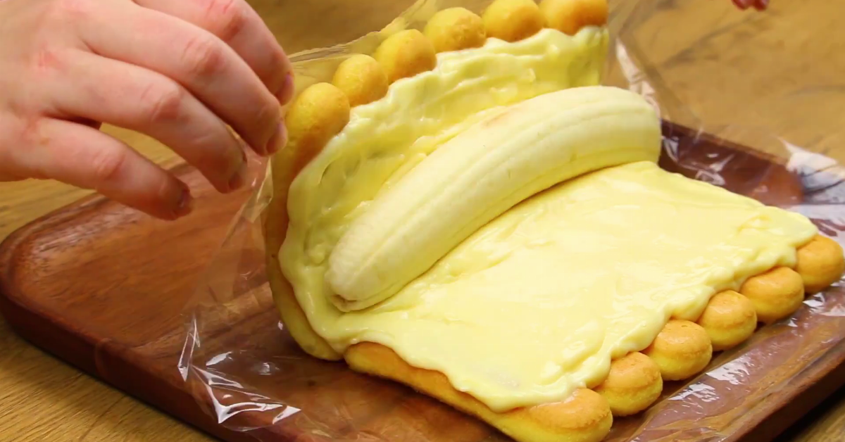 - Laissez ce mélange refroidir avant de tartiner votre lit de boudoirs avec. Déposez la banane épluchée sur le bas du lit de biscuit et roulez en vous aidant du film plastique. Laissez reposer au frais encore une heure.
