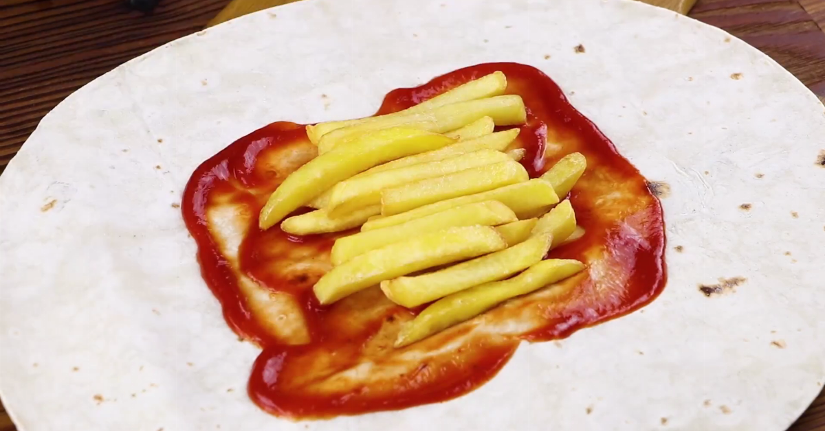 - Posez la tortilla à plat et en son centre, étalez du ketchup. Ajoutez les frites (cuites), puis la viande et le fromage, et enfin la salade, l'oignon coupé en morceaux, les tomates et le bacon. Vous n'avez plus qu'à rabattre les bords de la tortilla et à la rouler.