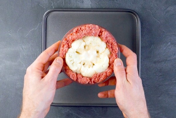 - Assaisonnez la viande hachée avec du sel et du poivre, puis entourez le dessus du chou-fleur avec la viande.