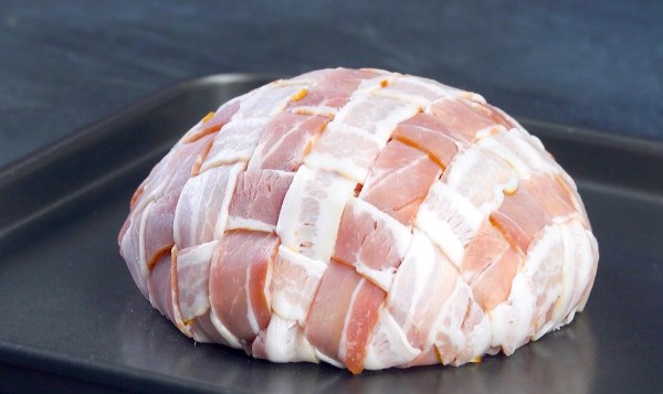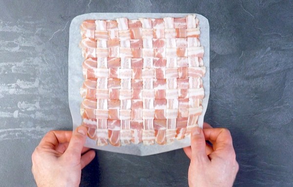 - Formez une grille avec les tranches de bacon sur un morceau de papier sulfurisé comme dans la vidéo.