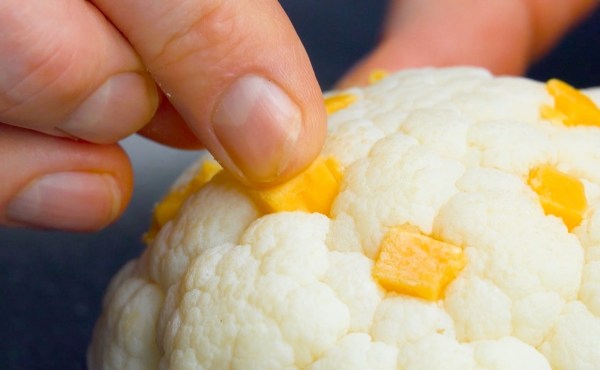 - Faites cuire le chou-fleur dans de l'eau salée, laissez-le refroidir et plantez ensuite avec les bâtonnets de cheddar dedans.