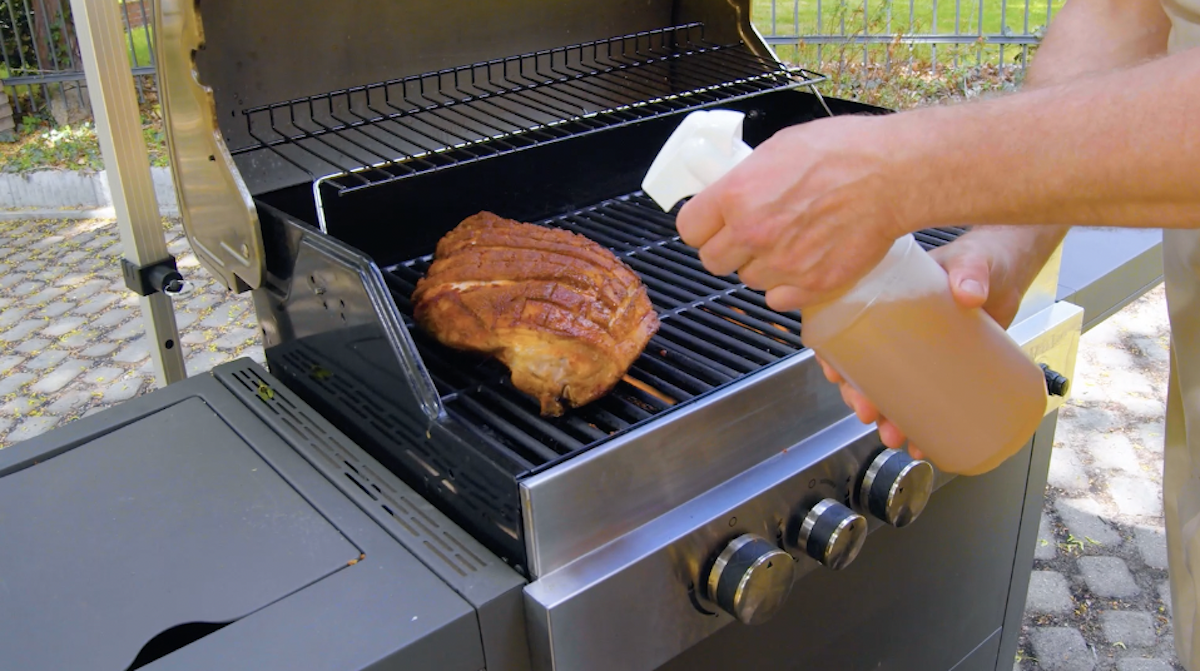1. Transvasez le jus de pomme dans une grande seringue et injectez-le dans la viande. Versez le reste du jus de pomme dans un vaporisateur. À l’aide d’un scalpel, incisez la couenne de la cuisse de cochon de lait en forme de croix. Mélangez tous les ingrédients pour la poudre magique, frottez la cuisse avec ce mélange d’épices et placez-la au réfrigérateur pendant une heure (idéalement : toute la nuit). Saisissez la cuisse à feu vif, puis laissez-la cuire à chaleur indirecte, barbecue fermé, pendant environ 3 heures. Vaporisez la viande de temps en temps avec le jus de pomme.
