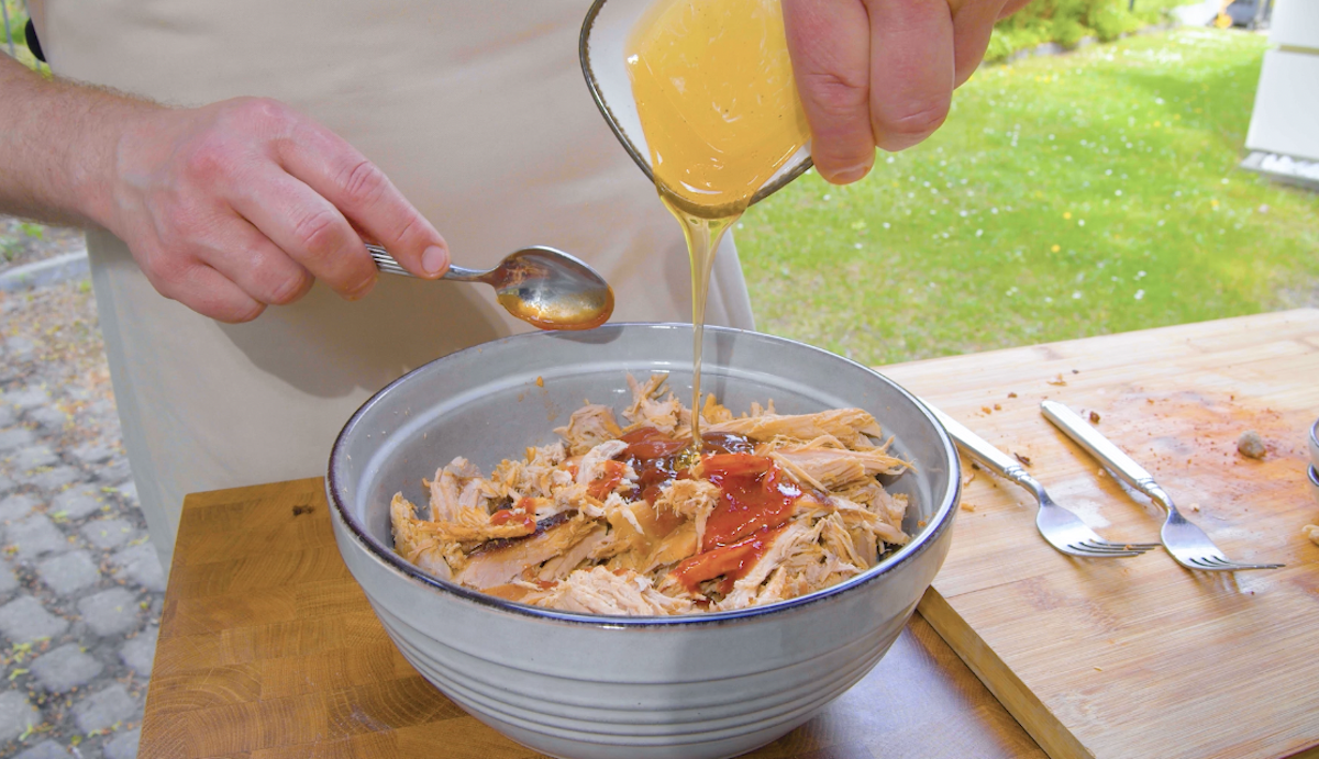 5. Retirez la couenne de la cuisse de cochon de lait cuite et, si nécessaire, placez-la sur le gril pour la faire griller. Retirez la viande de l’os et mettez-la dans un plat. Découpez-la en “lambeaux” à l’aide d’une fourchette pour qu’elle ressemble à un porc effiloché typique. Ajoutez ensuite la sauce BBQ, le miel et la sauce piquante et mélangez le tout.