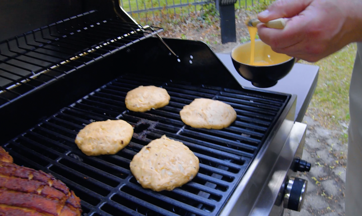 4. Travaillez le tout avec un crochet pétrisseur pour obtenir une pâte lisse. Laissez lever cette pâte pendant environ 45 minutes dans un endroit chaud, puis pétrissez-la encore une fois vigoureusement et formez des pains à burgers d’environ 140 g chacun. Laissez-les lever encore une fois pendant 20 minutes et placez-les ensuite sur le gril. Enduisez les pains d’œuf et faites-les cuire indirectement pendant environ 30 minutes avec le gril fermé.