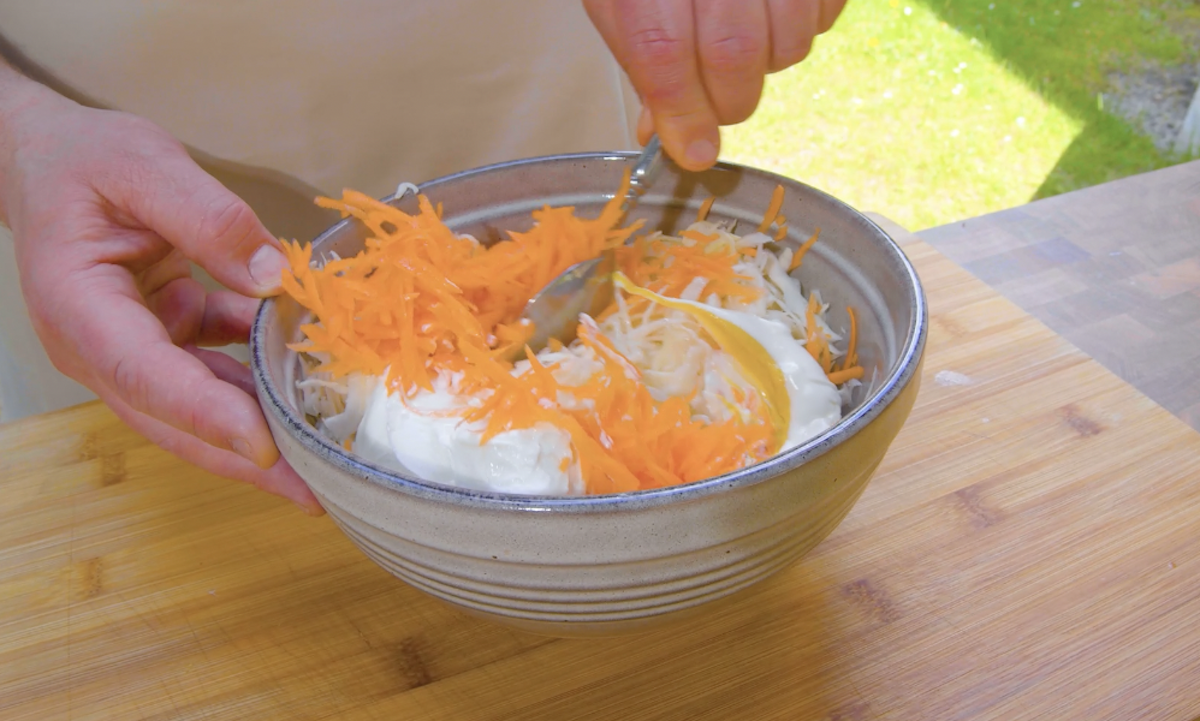 2. Coupez le chou blanc en deux et retirez le trognon. Râpez la moitié du chou en fines lamelles à l’aide d’un éplucheur et mettez celles-ci dans un saladier. Ajoutez du sel et pétrissez le tout avec vos mains pendant environ 5 minutes. Ajoutez également la carotte râpée, le fromage frais, la moutarde, la mayonnaise, le sucre brun, le jus de citron et le vinaigre blanc et mélangez le tout. Rectifiez l’assaisonnement avec du sel et du poivre pour terminer votre coleslaw.