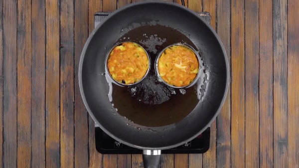 - Mélangez les pâtes cuites avec les oeufs battus puis assaisonnez avec du sel et du poivre. Mettez deux gros anneaux de métal dans une poêle avec de l'huile chaude et remplissez-les avec les nouilles aux œufs. Faites-les frire des deux côtés jusqu'à ce qu'elles soient croustillantes et répétez l'opération avec la portion pour le deuxième burger.