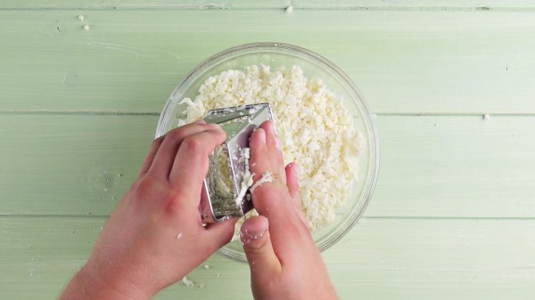 - Coupez d'abord le chou-fleur en bouquets et râpez-les avec une râpe à fromage fine. Placez le chou au micro-ondes pendant 5 minutes à 700 watts ou blanchissez-le dans de l'eau bouillante pendant 30 secondes. Déposez un torchon propre dans un saladier, versez le chou dessus, laissez-le refroidir un peu puis pressez le jus à l'aide du torchon.