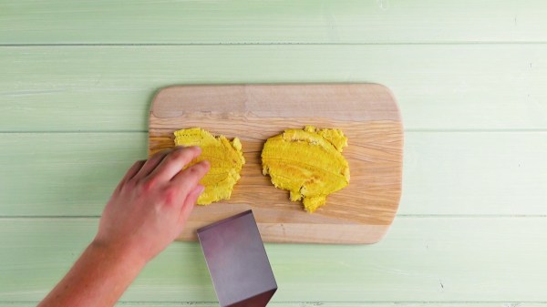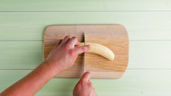 - Coupez les extrémités des bananes et épluchez-les. Coupez l'une des bananes en deux et faites frire les deux moitiés brièvement dans de l'huile. Aplatissez les moitiés sur le plan de travail avec une petite planche à découper et faites-les frire de nouveau brièvement dans l'huile. Répétez cette procédure avec la deuxième banane.