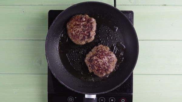 - Assaisonnez la viande hachée avec du sel et du poivre, formez deux galettes et faites-les dorer dans un peu d'huile. Quand les steaks sont cuits, recouvrez-les d'une tranche de fromage et attendez qu'il fonde.