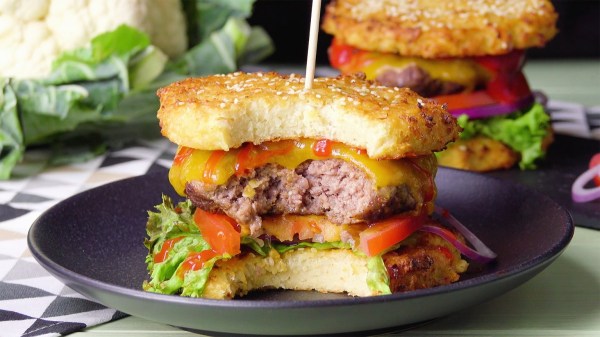 - Déposez un petit pain de chou-fleur sur l'assiette, recouvrez-le de salade et de rondelles d'oignons. Ajoutez une tranche de tomate et un steak par-dessus. Assaisonnez de ketchup avant de déposer un autre pain de chou-fleur avec des graines de sésame sur le dessus.