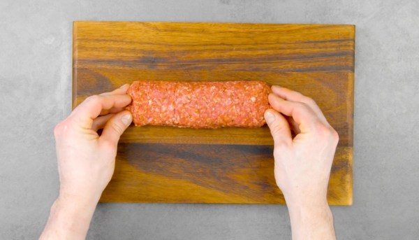 • Assaisonnez la viande hachée avec du sel, du poivre et du paprika et formez un rectangle sur un morceau de papier sulfurisé.
