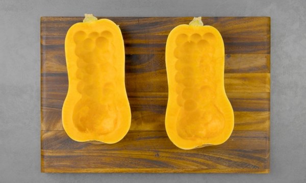 • Coupez la courge butternut en deux dans le sens de la longueur, retirez le trognon et évidez la courge.