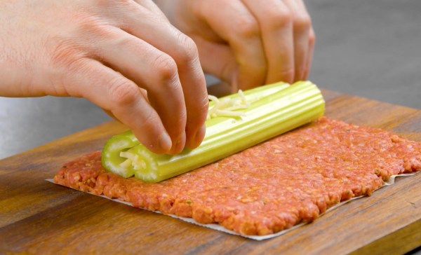 • Coupez les branches de céleri de manière à ce qu'elles soient un peu plus courtes que le côté le plus long du rectangle de viande hachée. Remplissez les branches de céleri avec du fromage râpé et posez ensuite les branches sur le rectangle.