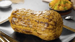 • Mettez les moitiés de courge l'une sur l'autre en veillant à ce que le rouleau haché soit bien entouré par le mélange de pain de mie. Placez ensuite la courge butternut farcie sur un moule à muffins retourné et enfournez-la pendant 60 minutes à 200 °C, à chaleur tournante.