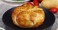 Découpez le camembert en deux disques. Entre les deux, déposez les oignons et les lardons suivis des tranches de pommes de terre. Refermez le camembert puis chaque pétale un à un sur le fromage.