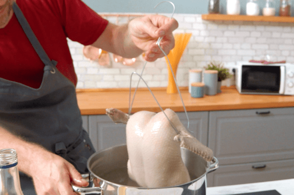 - Pliez le cintre de manière à pouvoir y suspendre le canard. Faites bouillir de l'eau et du vinaigre, plongez le canard pendant 5 minutes et essuyez-le ensuite.
