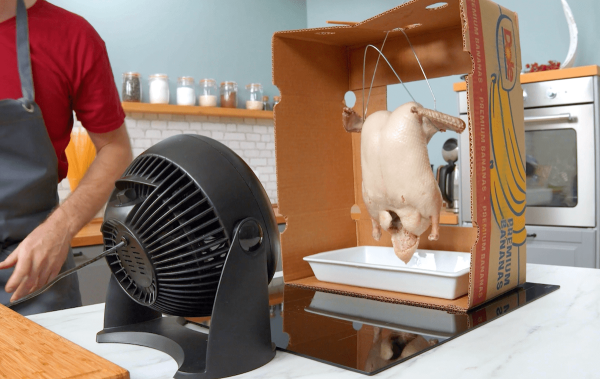 - Suspendez maintenant le canard dans un grand carton à l'aide de baguettes et placez une assiette ou un objet similaire sous le canard. Séchez ensuite le canard à l'aide d'un ventilateur. La peau doit être aussi sèche que possible pour que le glaçage puisse y adhérer plus tard.