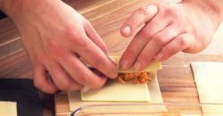 - Déposez une tranche de fromage sur chaque feuille de lasagne puis versez deux cuillères à soupe de la mixture au poulet sur l'une des extrémités. Roulez le tout pour former vos rouleaux de cannelloni. Mettez les rouleaux dans un plat allant au four.