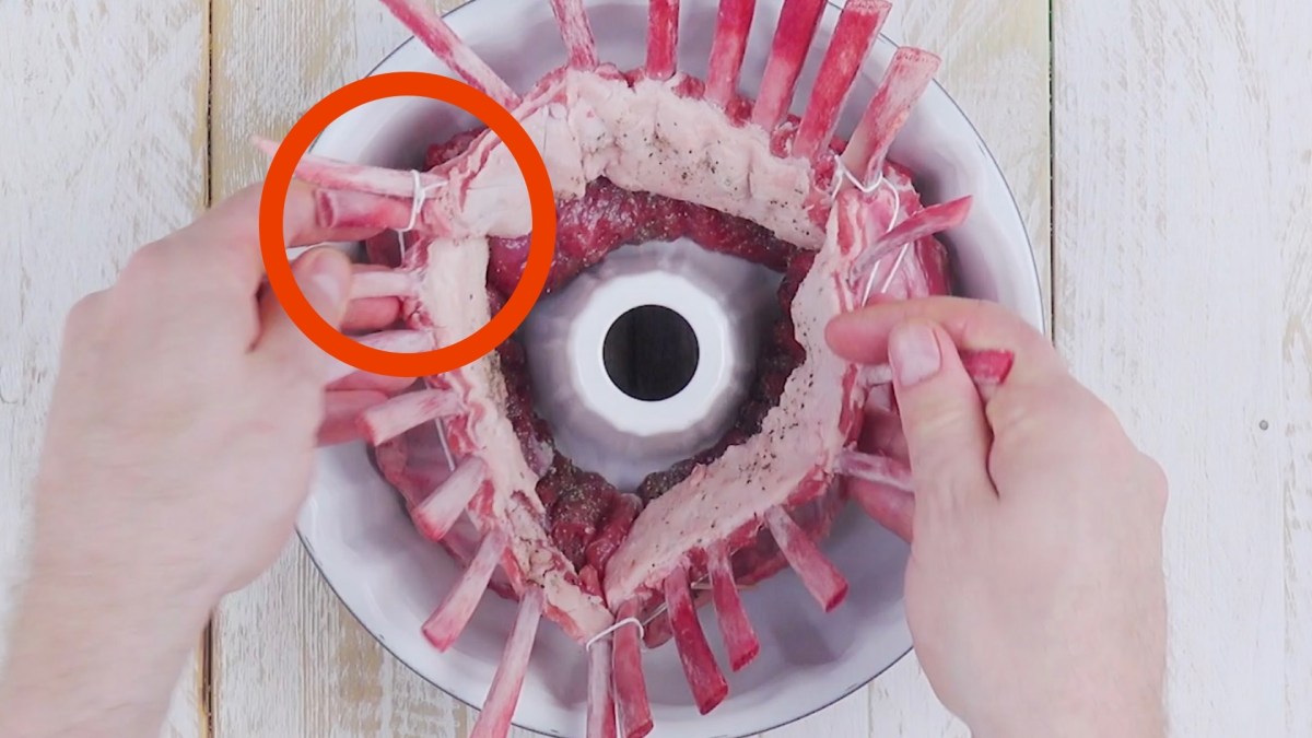 • Préchauffez le four à 180 °C. Frottez les carrés d'agneau avec les gousses d'ail et le romarin. Badigeonnez-les d'huile végétale et assaisonnez avec du sel et du poivre. Attachez les carrés d'agneau ensemble avec de la ficelle pour former une couronne et placez-les dans un moule à gâteau.
