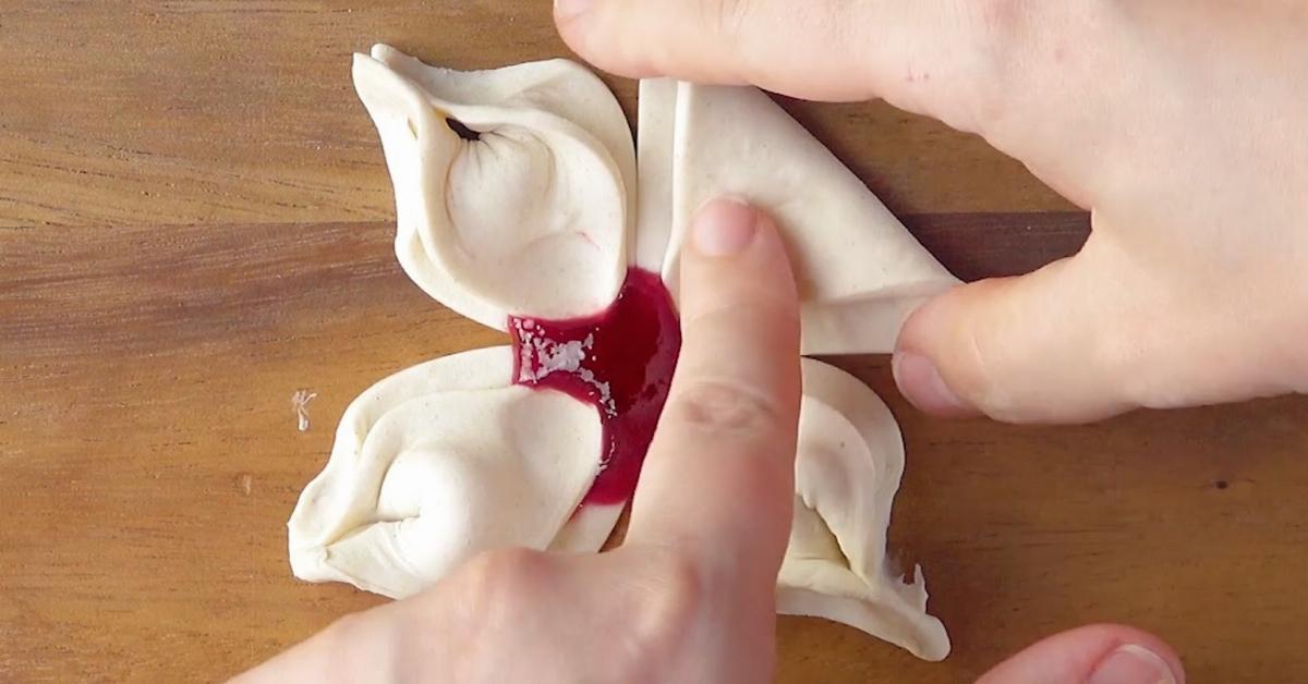 - Coupez la pâte feuilletée en carrés puis en triangles. Faites trois incisions triangulaires et écartez légèrement. Mettez une cuillère à café de confiture au milieu du plus petit triangle formé par les incisions, ajoutez une cerise par-dessus, puis enroulez le tout. Enfournez à 180 °C pendant 20 minutes.