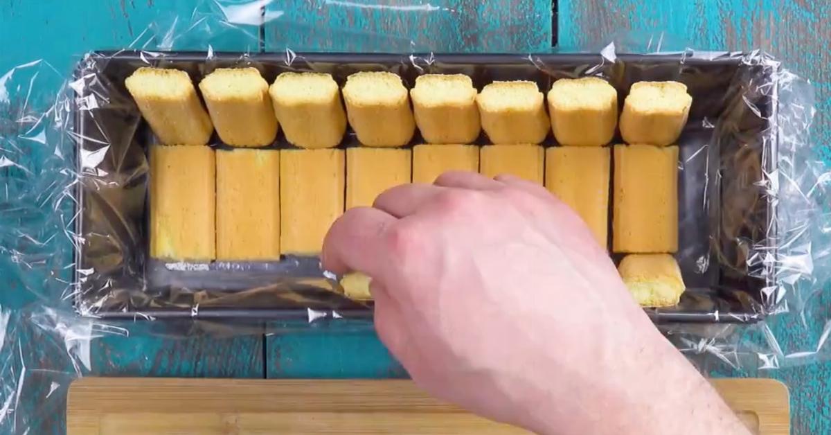 - Mettez un film plastique dans un moule à cake puis déposez des morceaux de boudoirs dans le fond et sur les parois. Ils ne doivent pas dépasser la hauteur du moule.