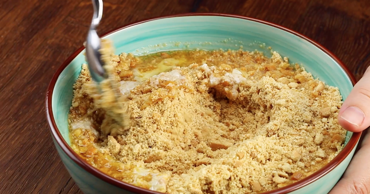 - Émiettez les Petits Beurre dans un saladier et versez le beurre fondu. Mélangez bien puis mettez le tout dans un plat allant au four. Pressez la mixture dans le fond du plat et laissez refroidir.