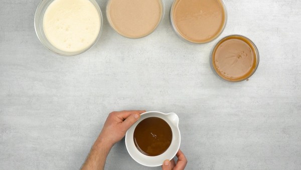- Faites fondre le chocolat au bain-marie. Mélangez maintenant 2 cuillères à soupe de chocolat dans le saladier contenant 600 g de pâte à cheesecake, 3 cuillères à soupe de chocolat dans le saladier avec 500 g de pâte et 4 cuillères à soupe de chocolat dans le saladier contenant 250 g de pâte. Le saladier avec 700 g de pâte reste tel quel. On obtient ainsi un joli dégradé de marron.