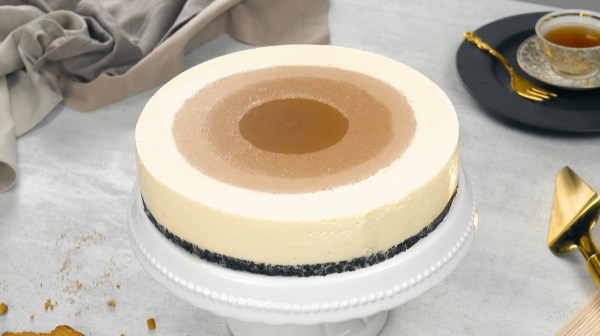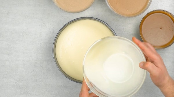 - Versez d'abord la pâte sans chocolat sur le fond de biscuits dans le moule à charnière. Ensuite, versez le contenu du saladier de pâte de 600 g (marron le plus clair) au milieu de la pâte blanche dans le moule. Puis, versez le contenu du saladier de 500 g de pâte au milieu du moule. Enfin, versez la pâte la plus foncée au milieu du moule.