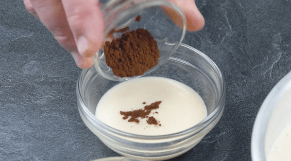 - Colorez un des deux récipients avec du chocolat en poudre et l'autre avec du cacao cru. De cette façon, vous obtiendrez une pâte marron clair et une pâte marron foncé.