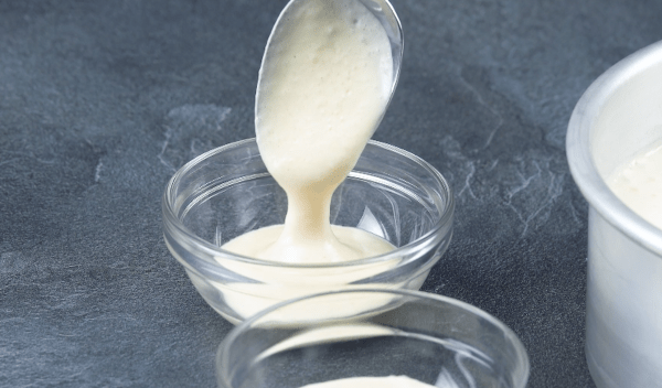 - Prenez 4 cuillères à soupe du mélange et versez-le dans 2 petits récipients. Versez le reste du mélange dans un moule à gâteau que vous aurez préalablement tapissé de papier sulfurisé. Veillez à ce qu'il n'y ait pas de bulles. Si c'est le cas, tapez légèrement le moule sur le plan de travail et utilisez la brochette pour les faire partir.
