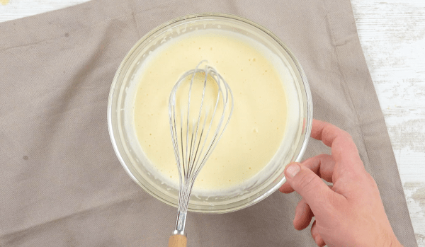 - Mettez un saladier sur une casserole remplie d'eau et mettez le jaune d’œuf, l'eau, le sucre, le jus de citron et le miel à l'intérieur. Faites chauffer la casserole bain-marie et remuez bien le tout. Retirez le saladier de la casserole et ajoutez la gélatine préalablement trempée et le fromage frais. Mélangez le tout. Lorsque le mélange est refroidi (à environ 25 °C), incorporez la crème fouettée.
