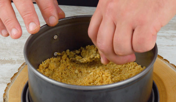 - Émiettez les biscuits Petit Beurre et mélangez les miettes avec le beurre fondu. Versez le mélange dans le fond du moule et pressez avec une cuillère. Laissez refroidir le moule pendant 30 minutes.