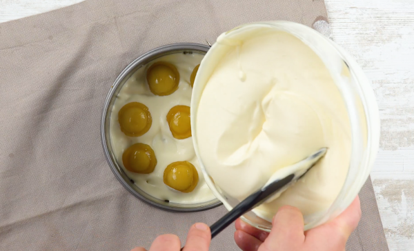 - Déposez environ 75 g du mélange sur le fond de biscuit refroidi et lissez le tout. Étalez les hémisphères de miel préalablement congelés sur la crème. Ajoutez 75 % du mélange dans le moule et mettez au frais pendant au moins 30 minutes.