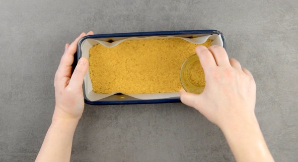 - Émiettez les biscuits au beurre et mélangez-les avec du beurre fondu. Recouvrez un moule à cake de papier sulfurisé et appliquez le mélange sur le fond du moule à l'aide d'un verre.