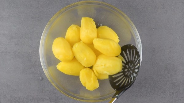 - Lavez et épluchez les pommes de terre. Faites-les bouillir dans de l'eau salée jusqu'à ce qu'elles soient tendres, puis laissez-les mijoter à couvert pendant environ une demi-heure avant de les retirer de l'eau.